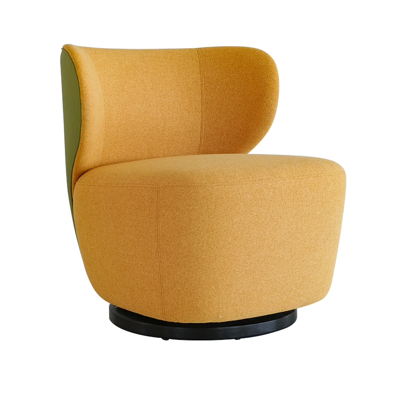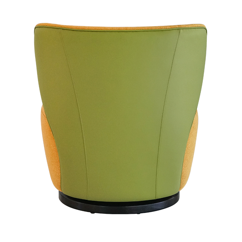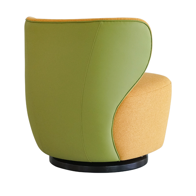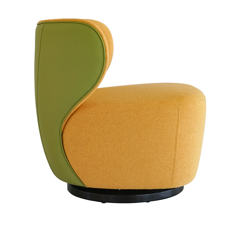 This Selead hotel sofa chair is made of a combination of fabric and PU leather patchwork. It is a yellow single sofa chair which has green arms and back. The rounded curves have a unique shape, and the clashing colors of orange and green have a vibrant design. The black round base allows the chair to swivel freely.