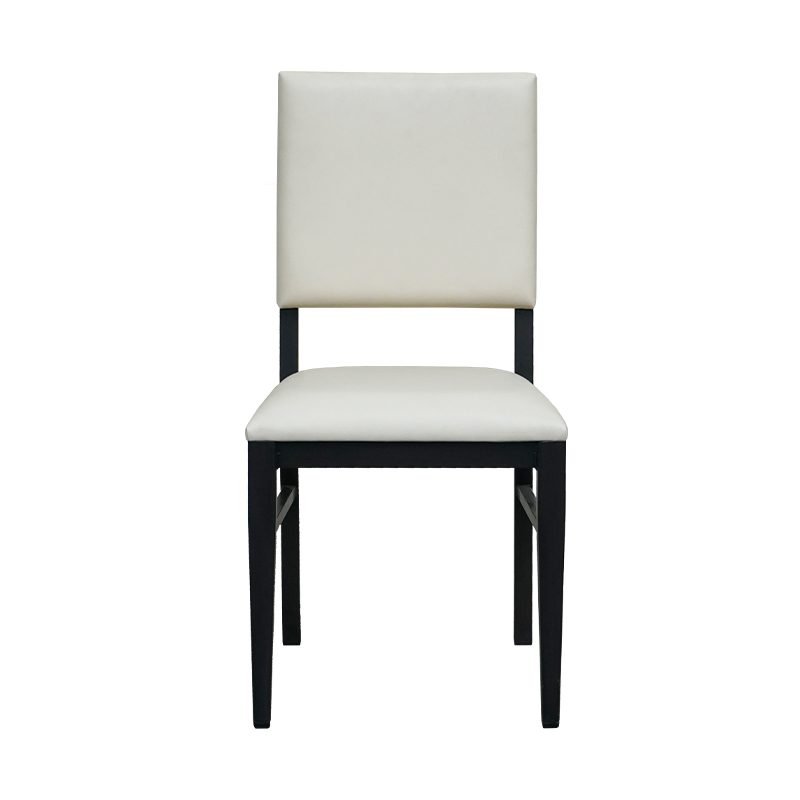The hotel restaurant dining chair has a stylish and minimalist design with a white commercial vinyl seat and black metal frame that is both beautiful and practical.