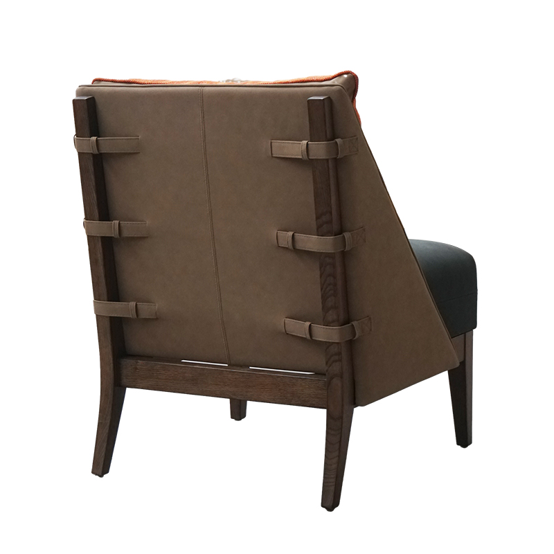 The Selead hotel lobby chair is a modern minimalist design made of faux leather, fabric and wood. Its seat and back are covered in thick faux leather, giving it a cozy feel. The wood frame adds a touch of vintage feel to it.